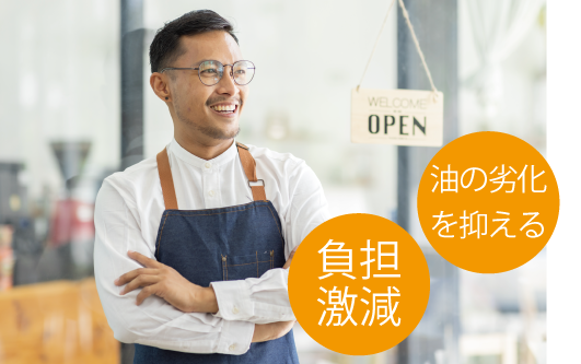 ワンタッチの自動ろ過なので、作業 負担が激減します。 揚げカスをしっかり除去できるので、 油の劣化を最小限に抑えます。